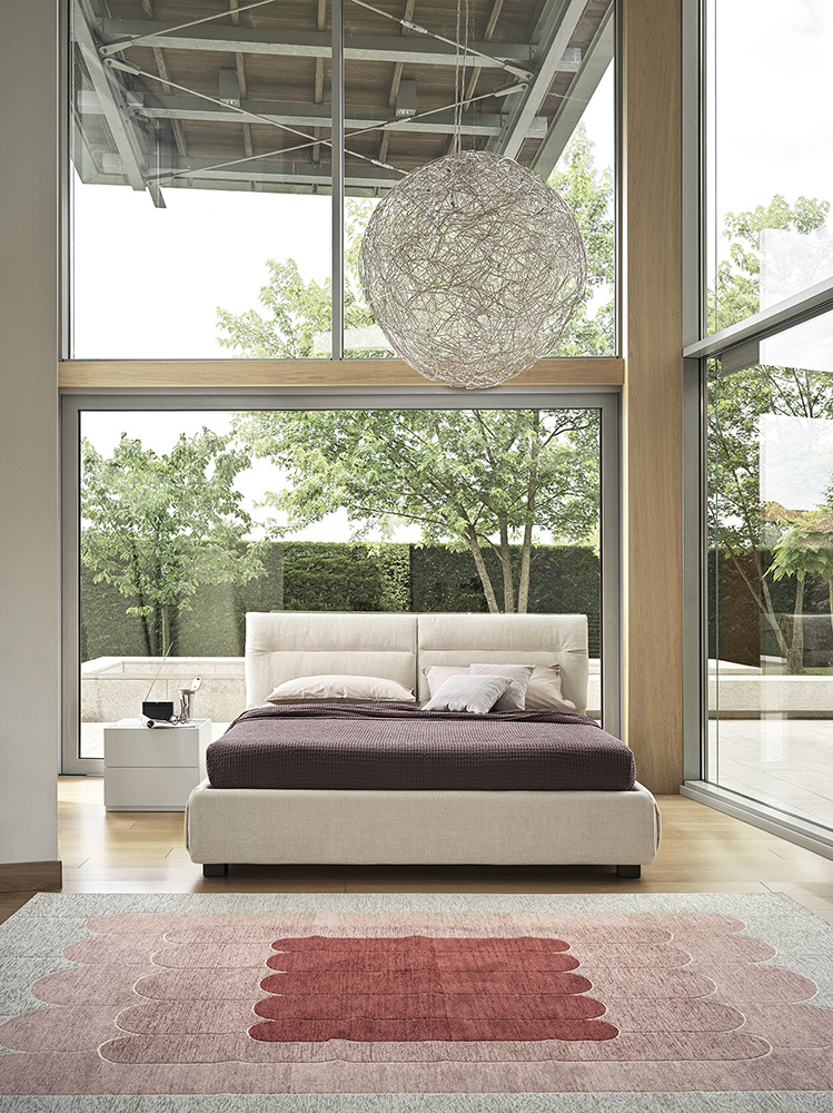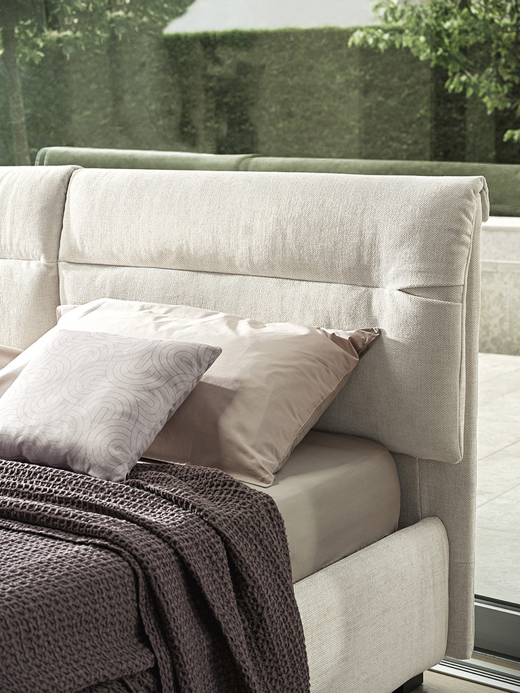 The Austin project is a bed-with-integrated-headboard-pillow redux. These two soft comfortable cushions have been elevated with a tuck which, like a detail on a sartorial suit, becomes the hallmark of a product that enhances the tactile beauty of leather and fabric alike. The horizontal topstitching traces out a connecting line which tempers the visual impact and creates an elegant refined aesthetic for a bed which has the added option of a container unit.