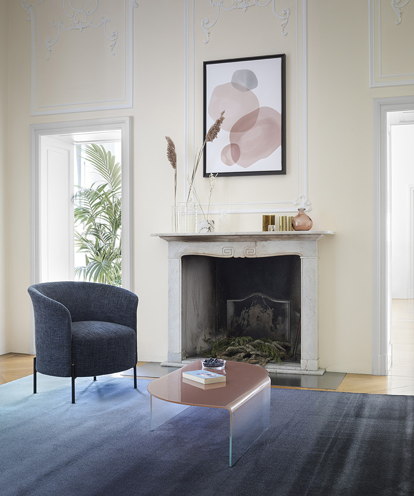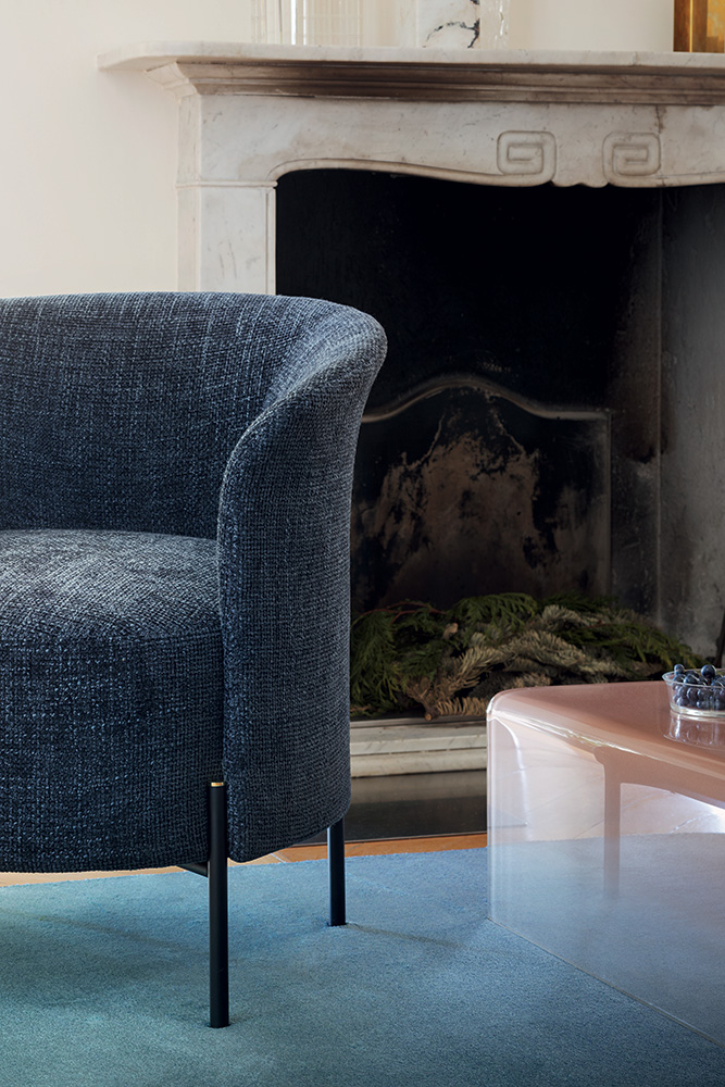 Sillón lounge acogedor y elegante. El asiento está hecho con una estructura de correas elásticas que soporta el poliuretano, garantizando comodidad y durabilidad. Para asegurar un espesor sutil, combinado con curvas armoniosas, el respaldo está hecho de poliuretano espumado en frío, revestido y tapizado. 4 pies metálicos a la vista sostienen la estructura y le confieren elegancia gracias a la parte final en acabados de latón pulido o níquel negro.