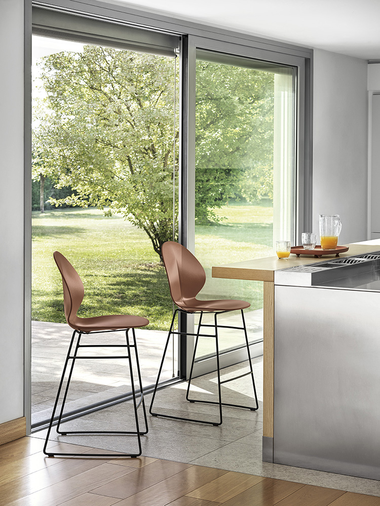 BASIL model stool, shell with a sophisticated design and metal sled base.Its shape evokes the form of a basil leaf. The central ribbing becomes at the same time the structural and decorative theme of the product. Metal sled base with footrest.The BASIL stool represents a great choice in the kitchen or a lounge bar. Discover all the finishes!