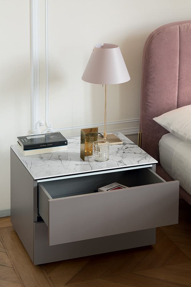 Night stand, dresser and chest of drawers for the bedroom that change their look according to the different finishes and patterns of the fronts that can be smooth or wavy, lacquered or in natural wood. The drawers feature a "push-pull" opening system.
