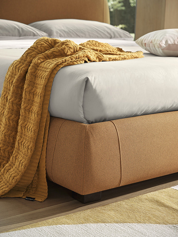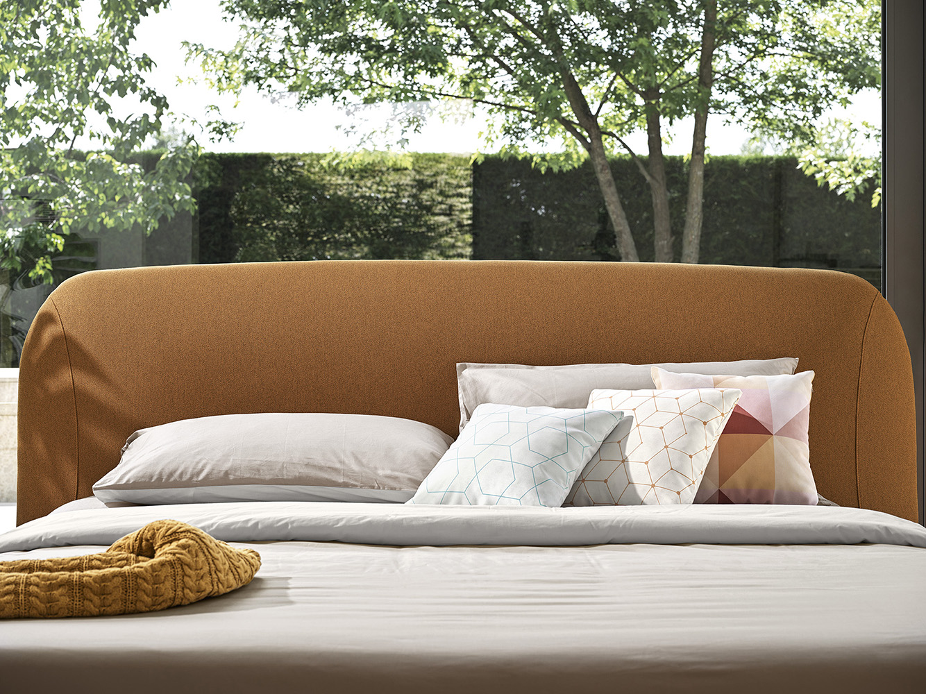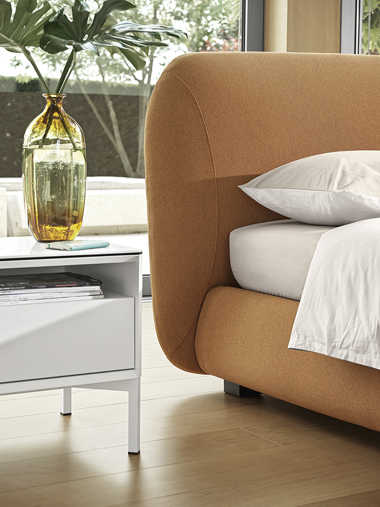 Noa is a sculptured bed with a harmoniously rational structure drawing inspiration from rocks sculpted by the wind. Soft and voluminous, the simple-looking headboard has a three-dimensional beauty which is accentuated further by the topstitching on the curved surfaces. The item is available with three versions of the feet in wood or one version of the feet in metal with the option of choosing a look and height from the ground that suits the customer best. Noa is available with a fixed bed base or container unit. Can be upholstered in fabric or leather.