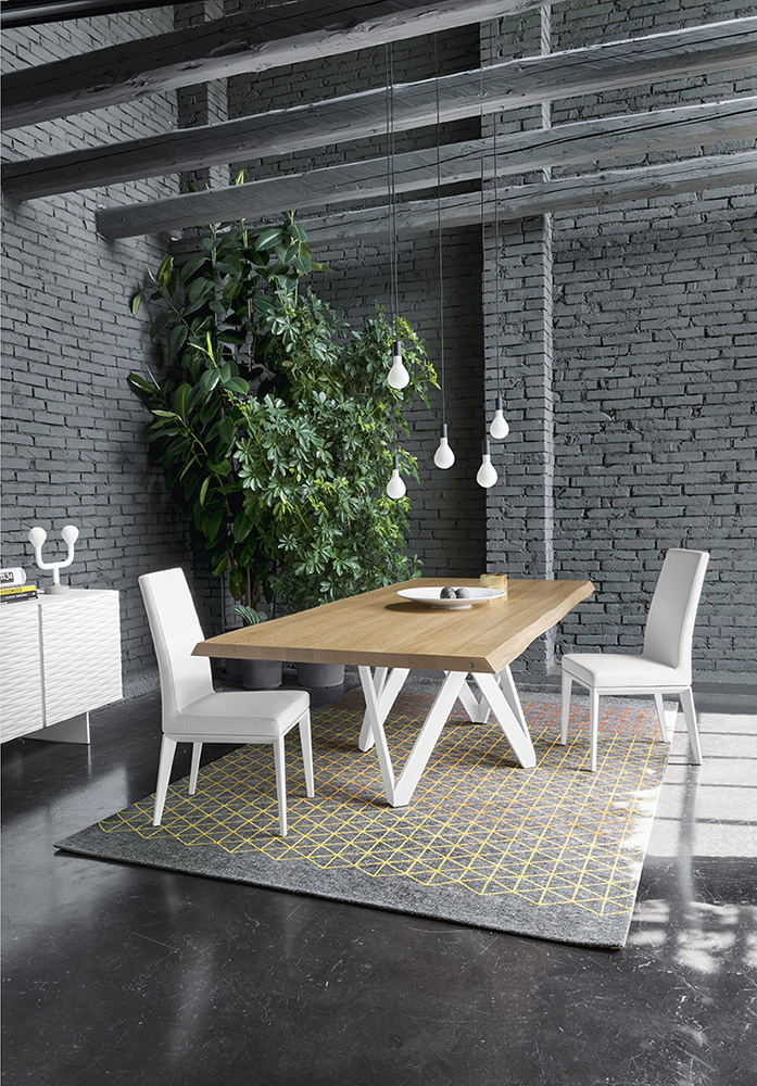 The legs and the sides of the frame, with an almost triangular faceted shape, are made of solid wood while the seat is fitted with elastic belts.