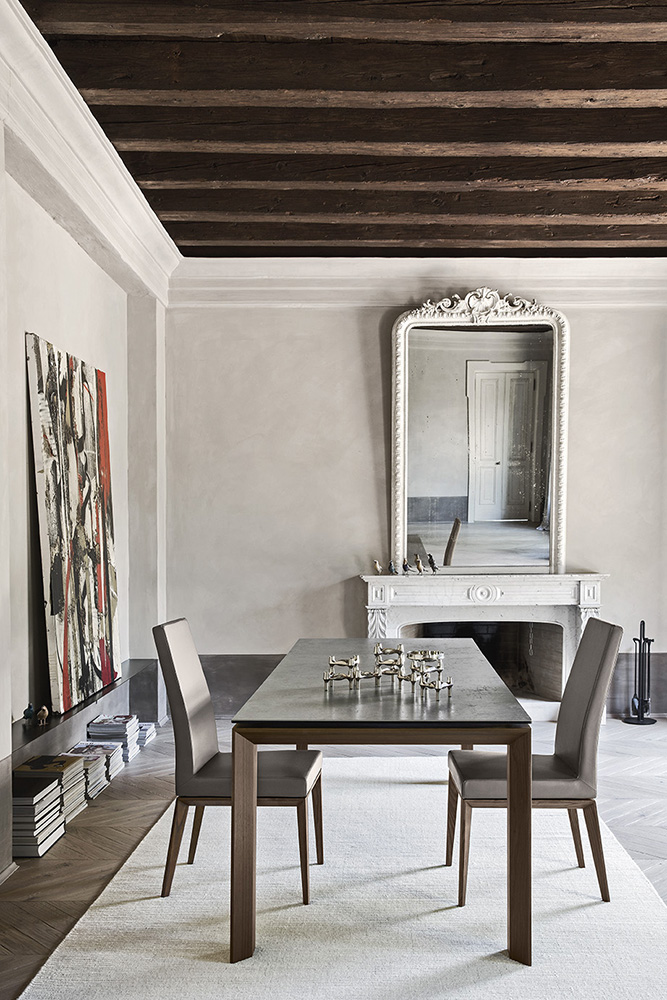 The attention to the design of the chair can also be seen in the visual continuity of the slightly curved line formed between the back legs and the high backrest.