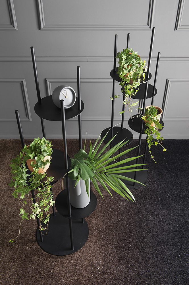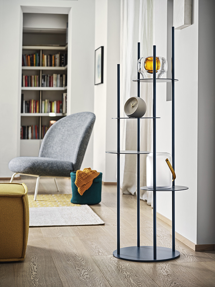This design piece puts a new slant on furnishing accessories. CIRCLES is a highly original way to keep your most important belongings in view without taking up too much space. This columnar totem in tubular metal has 4 circular metal sheet shelves. Made to match the column, the circular shelves have been placed at different heights and the tubular rods also come in differing heights, creating a visually striking arrangement.