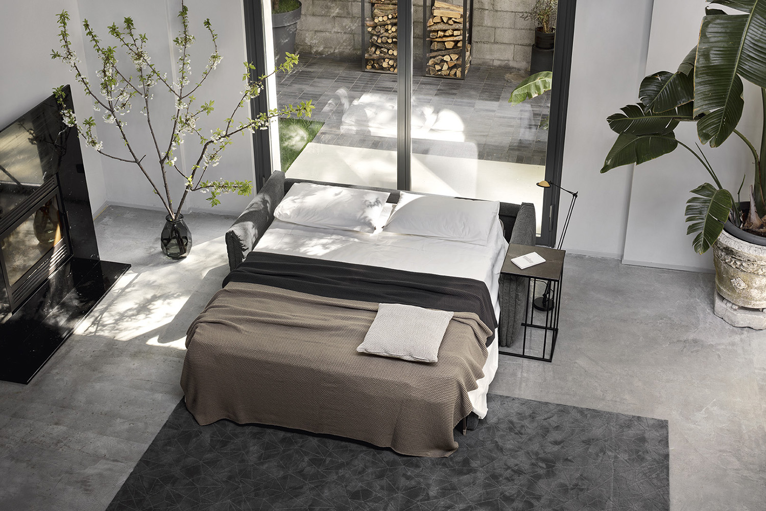 Darwin reproduces the design detail of the Landa sofa with the folded-over cushion. A stylish statement for a sofa bed that might be downsized but is definitely big on personality. It has a semi-automatic mechanism and the mattress is included. It can be easily opened up by pulling a matching band concealed by the backrest and closes again just as effortlessly without any need to move cushions or anything else.