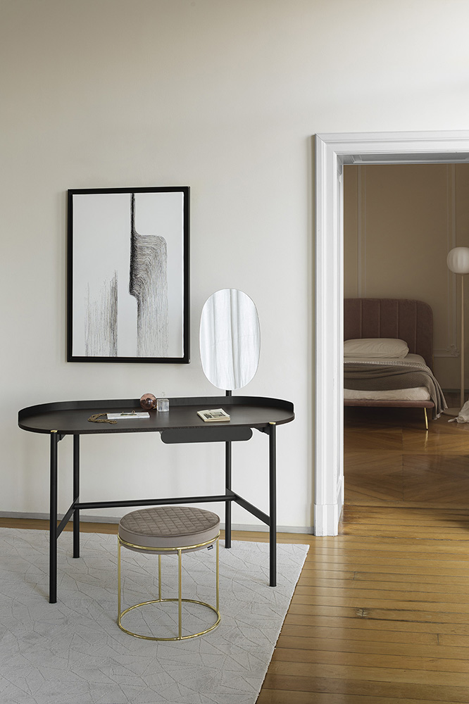 Madame is a versatile writing desk designed to meet a variety of different requirements. By adding a mirror, you can turn it into a dressing table. Madame is a happy meeting of sleek pristine geometric lines. The perfection of an oval is its leitmotif, as can be gathered from the shape of both the top and drawer.