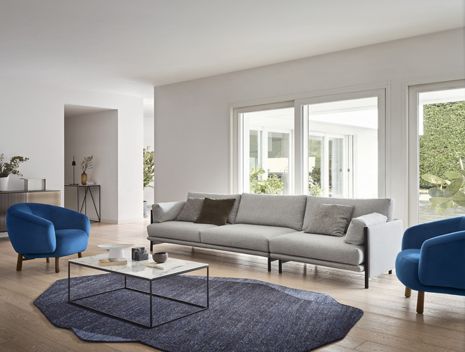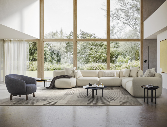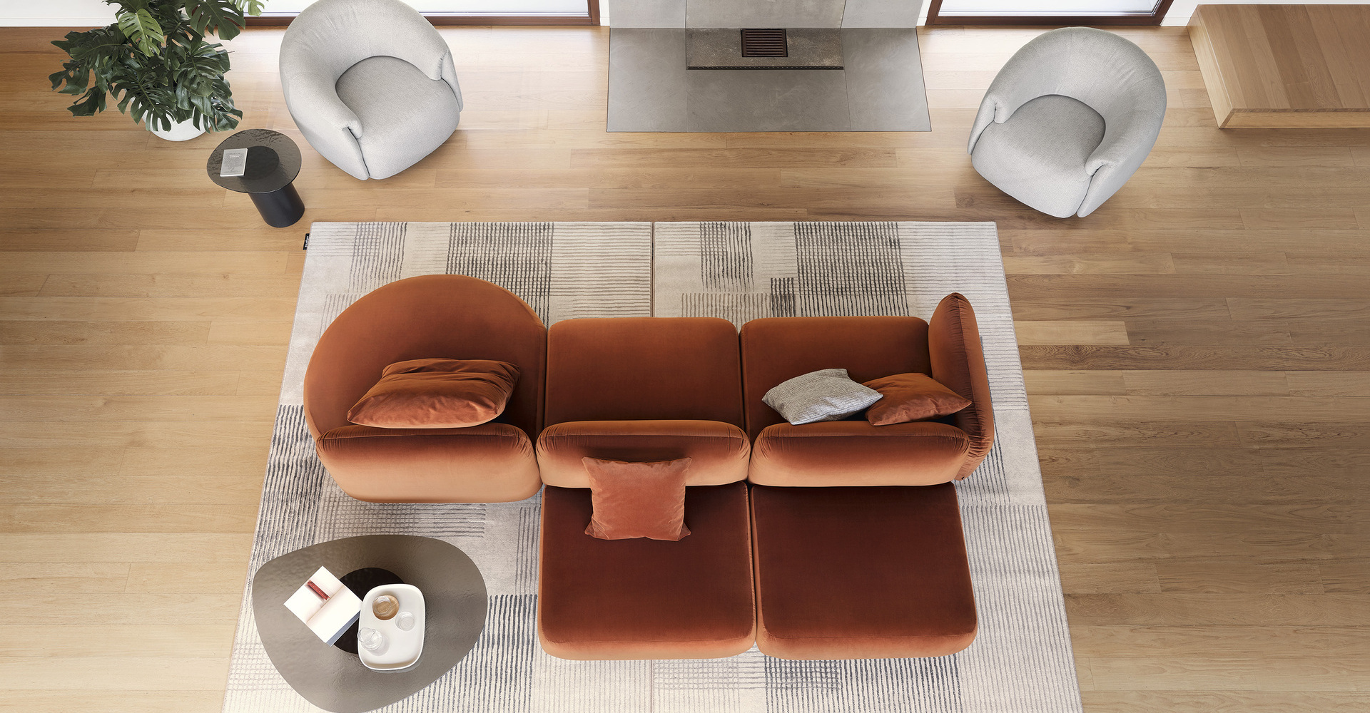 Soft and enveloping lines recur in all the elements of the collection, which includes various modules that allow the creation of linear compositions, angular or unu-sual shapes, always characterized by the play of shapes and a cozy looking depth.
