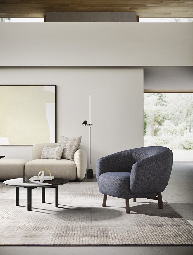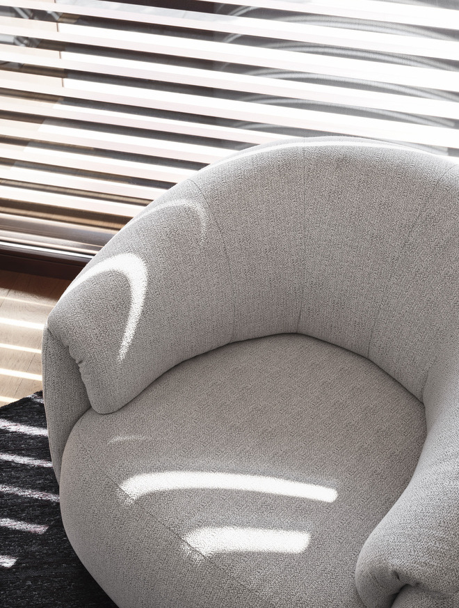 The Rio armchair welcomes those who use it in its almost protective seat, for an enveloping idea of comfortable relaxation. Versatile and meaningful, with its elegant proportions, it is the expression of a return of sinuous and gene-rous lines, enhanced by the absence of edges and details of "couture".